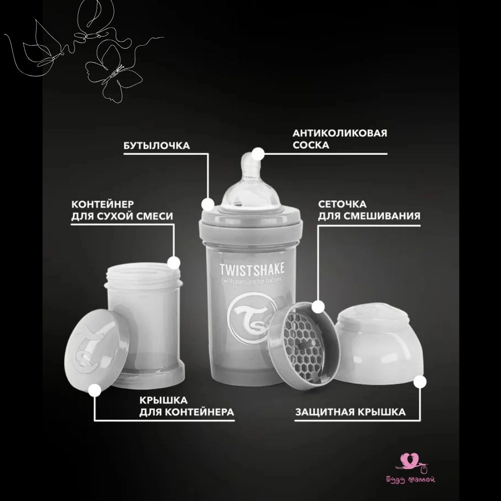 Конструкция бутылочки делает процесс кормления комфортным как для вас, так и для вашего малыша: контейнер 100 мл позволит взять детское питание с собой, сеточка для смешивания уберёт неприятные комочки, а система TwistFlow снизит вероятность возникновения колик и обеспечит равномерный поток.