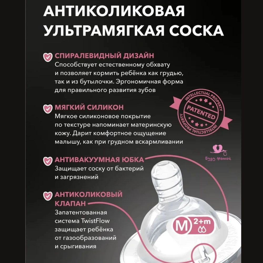 🔹 Соска бутылочки сделана из гипоаллергенного силикона и по форме максимально приближена к форме материнской груди.