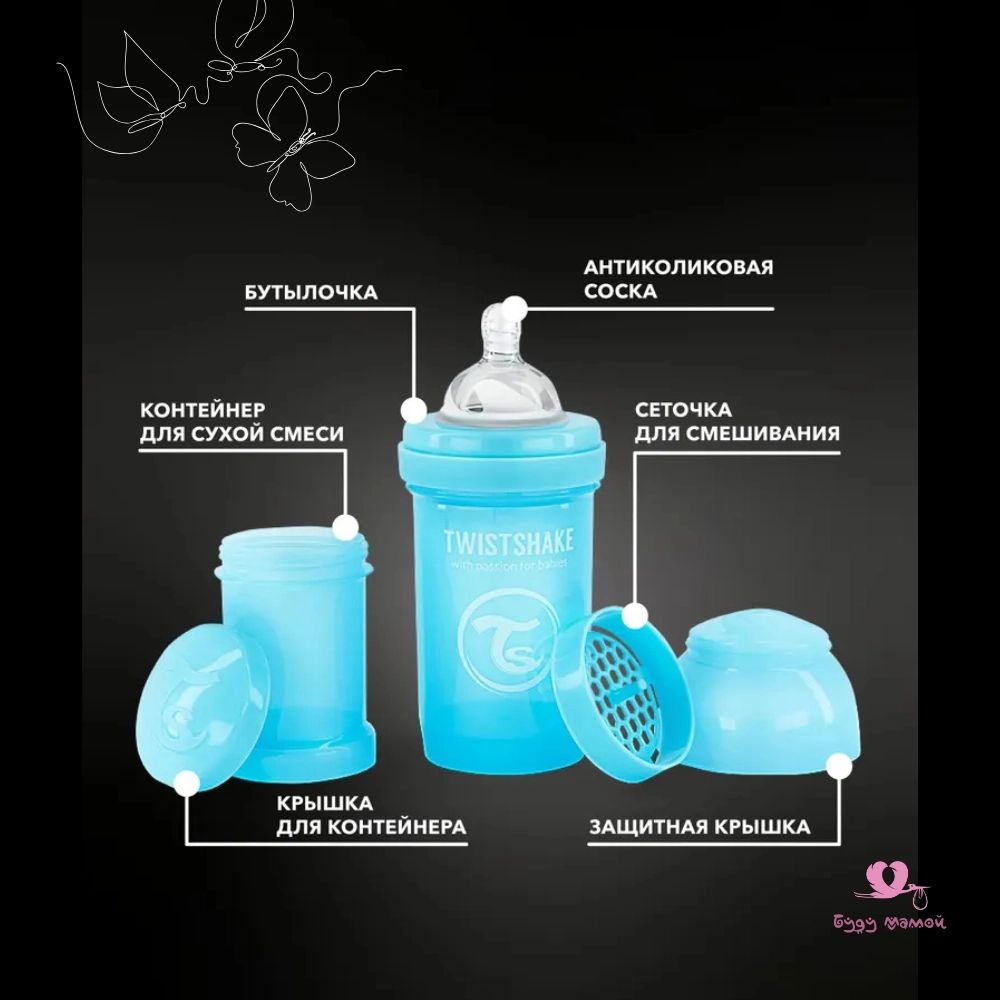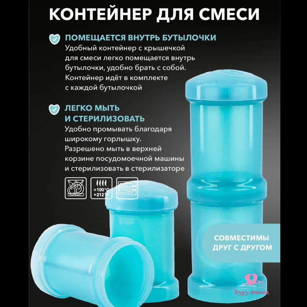 Конструкция бутылочки делает процесс кормления комфортным как для вас, так и для вашего малыша: контейнер 100 мл позволит взять детское питание с собой, сеточка для смешивания уберёт неприятные комочки, а система TwistFlow снизит вероятность возникновения колик и обеспечит равномерный поток.