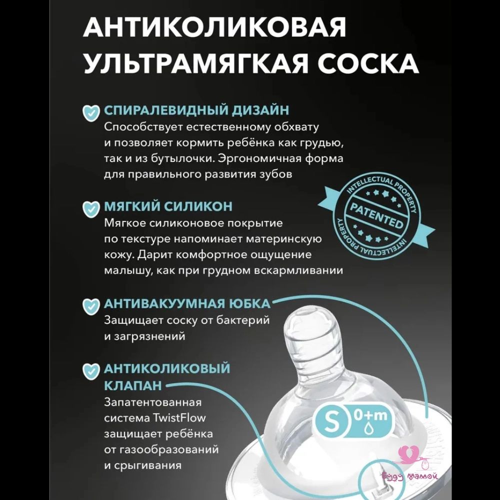 🔹 Соска бутылочки сделана из гипоаллергенного силикона и по форме максимально приближена к форме материнской груди.