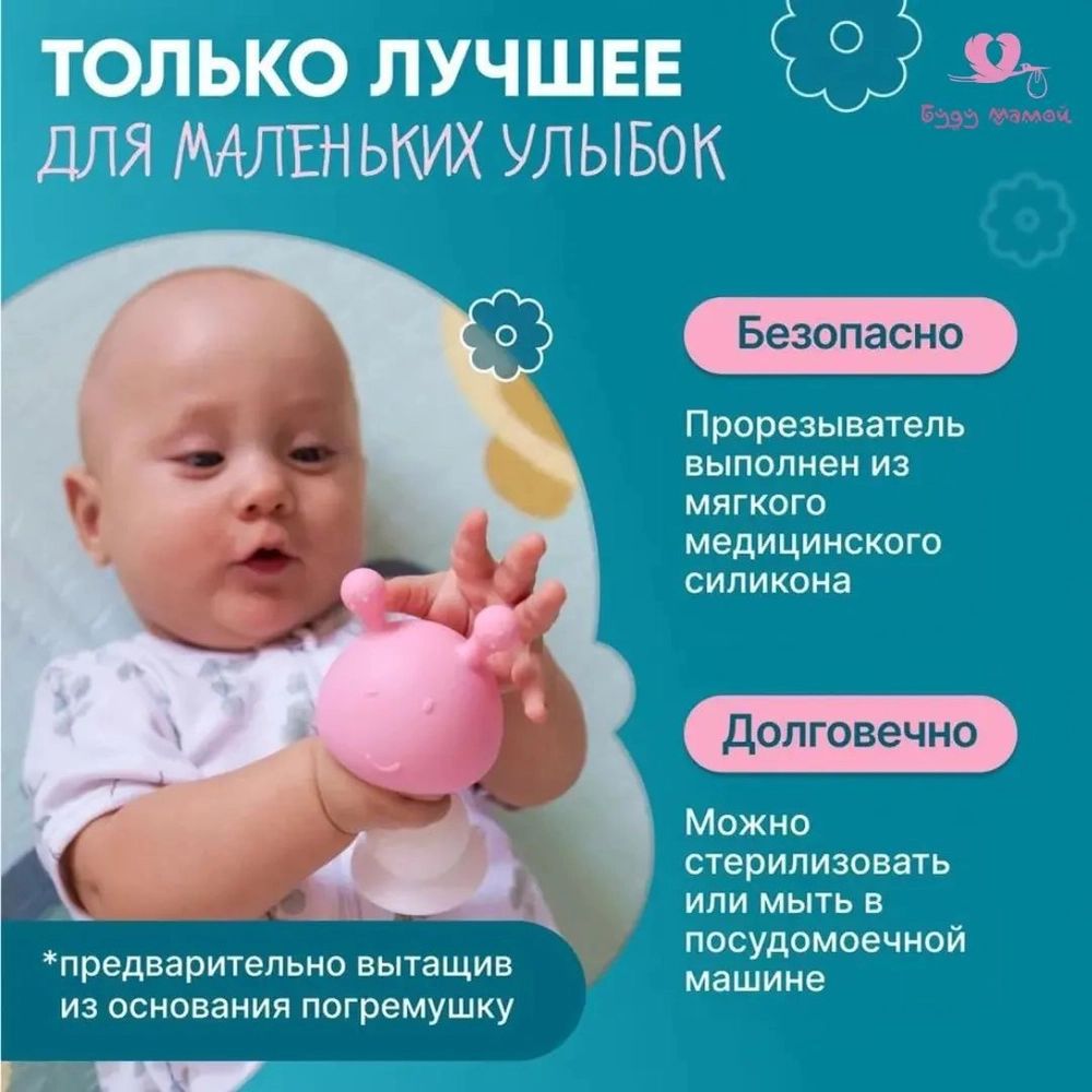 🔸️Прорезыватель для зубов в форме грибочка безопасно массирует десны двумя ушками разной степени жесткости с пупырышками и снимает неприятные ощущения во время прорезывания передних и задних жевательных зубов.