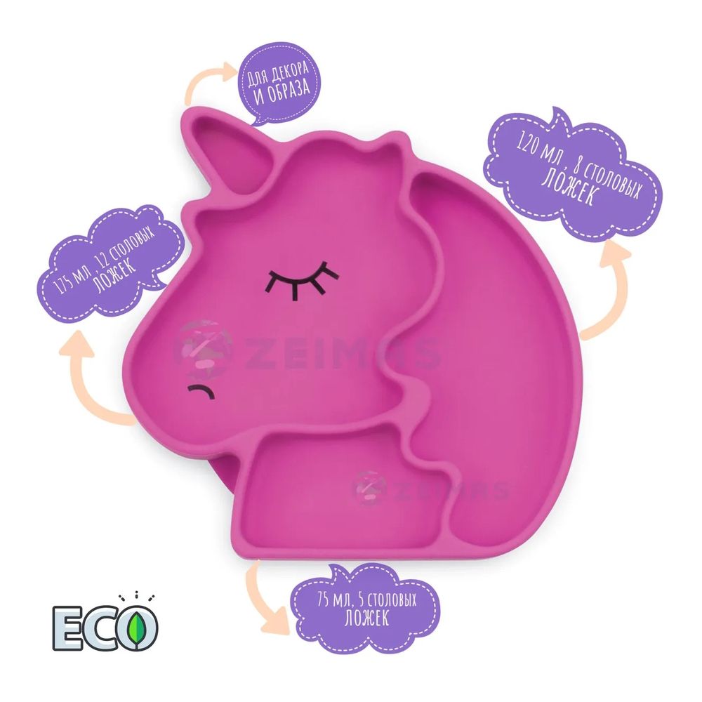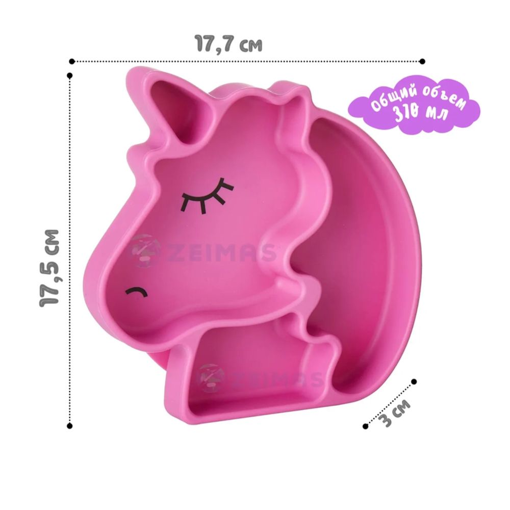 Силиконовая тарелка Zeimas «Единорог» + ложечка в подарок, идеально подходит для детей, которые учатся самостоятельно питаться. Сильная основа всасывания гарантирует, что тарелка не перевернётся - даже с самым активным малышом. Отлично подходит для использования на подносах или столах-стульчиках. Разделительные секции на тарелке соответствуют размеру маленьких порций еды. Тарелка выполнена в форме головы Единорога (популярный детский персонаж). Размер тарелки: 17,5 x 17,7 x 3 см. Поделена на 3 секции, размеры: 175 мл ;120 мл;75 мл. Общий объём: 370 мл.