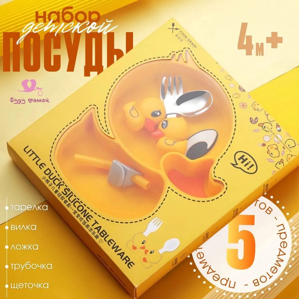 Детская посуда силиконовая, 5 предметов (уточка)